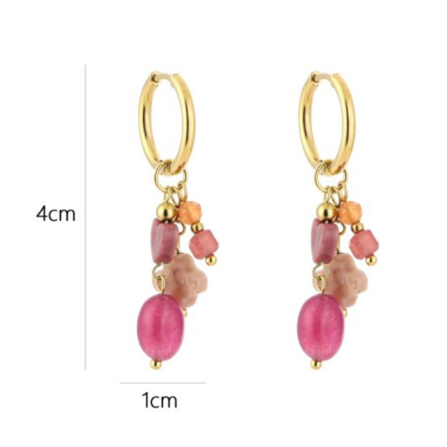 Oorbellen met kralen en natuur stenen roze/oranje