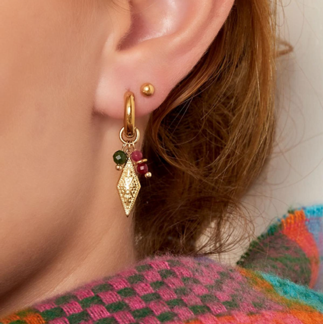 Oorbellen ruit met bedels goud/groen/rood